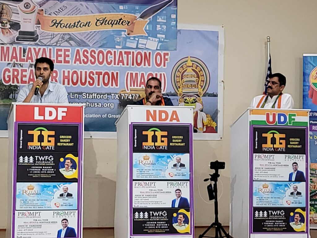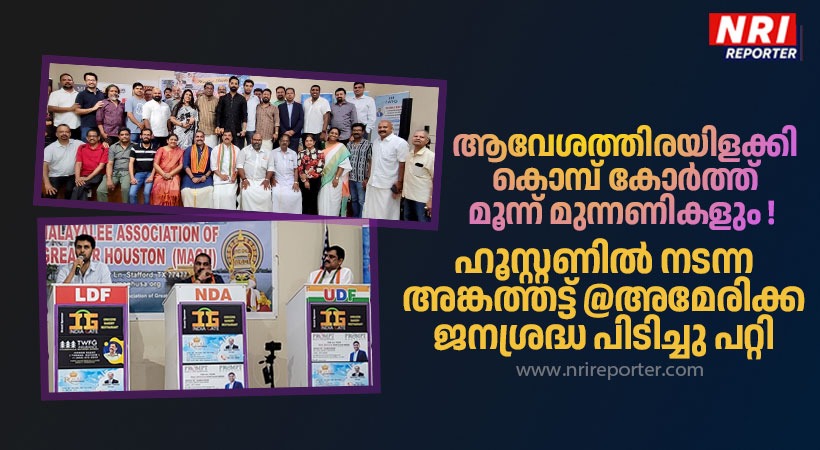 ആസന്നമായിരിക്കുന്ന കേരള നിയമസഭാ തിര ഞ്ഞെടുപ്പിനോടനുബന്ധിച്ചുള്ള പ്രചാരണം കേരളത്തിൽ ആവേശത്തിന്റെ അലയടികൾ ഉയർത്തിക്കൊണ്ട് മുന്നേറുമ്പോൾ അതിന്റെ പതിൻമടങ്ങു ആവേശവുമായിട്ടാണ് ഹൂസ്റ്റണിൽ ചൂടേറിയ ഇലക്ഷൻ ഡിബേറ്റ് നടന്നത്അമേരിക്കയിലിരുന്നു ടിവി സ്ക്രീനുകളിൽ കാണുന്ന ഇലെക്ഷൻ ഡിബേറ്റുകളെയൊക്കെ വെല്ലുന്ന വാഗ്വാദങ്ങളും ചോദ്യോത്തരങ്ങളുമാണ് 3 മണിക്കൂർ നീണ്ടു നിന്ന അങ്കത്തട്ടിനെ വേറിട്ടതാക്ക്കി മാറ്റിയത്.
