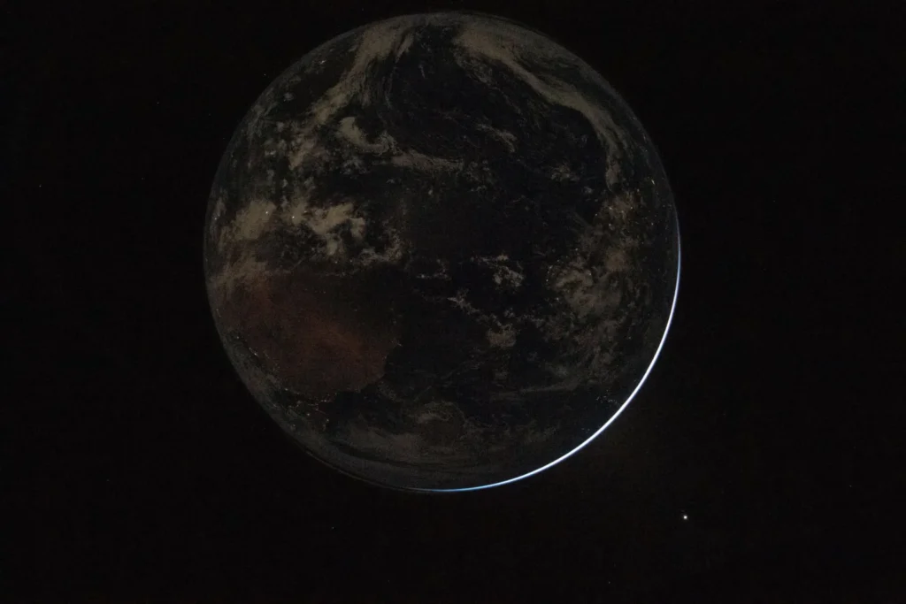 പേടകത്തിൽ നിന്നെടുത്ത മറ്റൊരു ചിത്രത്തിൽ ഭൂമിയുടെ പകൽ-രാത്രി വിഭജനം, “ടെർമിനേറ്റർ” എന്നറിയപ്പെടുന്ന രേഖ, വ്യക്തമായി കാണാം. ചന്ദ്രപ്രകാശത്തിൽ ഭൂമിയുടെ ഇരുണ്ട ഭാഗം തെളിഞ്ഞുനിൽക്കുന്ന മനോഹര കാഴ്ചയും സംഘം പങ്കുവെച്ചു.