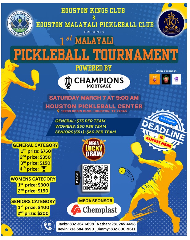 ഹൂസ്റ്റൺ കിംഗ്സ് ക്ലബ്ബും ഹൂസ്റ്റൺ മലയാളി പിക്കിൽബോൾ ക്ലബ്ബും സംയുക്തമായി അവതരിപ്പിക്കുന്ന ആദ്യ മലയാളി ഓപ്പൺ പിക്കിൽബോൾ ടൂർണമെന്റ് 2026 മാർച്ച് ഏഴിന് നടക്കും. ചാമ്പ്യൻസ് മോർട്ട്ഗേജ് ആണ് ടൂർണമെന്റിന്റെ പ്രധാന സ്പോൺസർ. കെംപ്ലാസ്റ്റും മത്സരത്തിൻ്റെ മെഗാ സ്പോൺസറാണ്. ടൂർണമെന്റ് രാവിലെ 9:00 മണിക്ക് ഹൂസ്റ്റൺ പിക്കിൽബോൾ സെന്ററിൽ ആരംഭിക്കും.