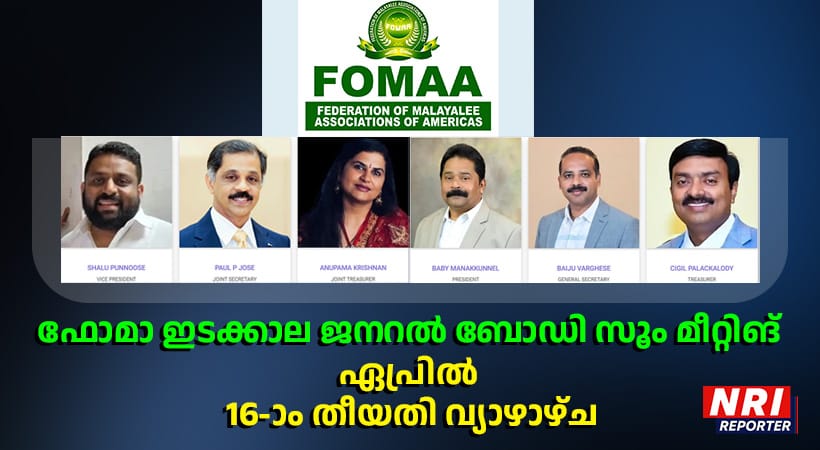 ഹൂസ്റ്റണ്: ചില സാങ്കേതിക കാരണങ്ങളാല് മാറ്റിവച്ച ഫോമാ ഇടക്കാല ജനറല് ബോഡി സൂം മീറ്റിങ് പുതുക്കിയ തീയതിയനുസരിച്ച് ഏപ്രില് 16-ാം തീയതി വ്യാഴാഴ്ച രാത്രി 9 മണിക്ക് നടക്കുമെന്ന് പ്രസിഡന്റ് ബേബി മണക്കുന്നേല് അറിയിച്ചു. ആര്.വി.പി.മാര്, നാഷണല് കമ്മിറ്റി മെമ്പേഴ്സ് ഉള്പ്പെടെയുള്ളവര് ഇതൊരറിയിപ്പായി സ്വീകരിക്കമെന്ന് എക്സിക്യൂട്ടീവ് കമ്മിറ്റിക്കു വേണ്ടി സെക്രട്ടറി ബൈജു വര്ഗീസ് അഭ്യര്ത്ഥിച്ചു. 2025 ഒക്ടോബര് 25-ാം തീയതി ഫിലഡല്ഫിയയില് ചേര്ന്ന മിഡ് ടേം ജനറല് ബോഡിയില് അംഗീകരിച്ച ബൈലോ ഭേദഗതിയനുസരിച്ച് പുതുതായി രൂപീകരിക്കപ്പെട്ട റീജിയനുകളുടെ അപ്രൂവല് അടക്കമുള്ള കാര്യങ്ങളാണ് അജണ്ടയിലുള്പ്പെടുത്തിയിരിക്കുന്നത്.