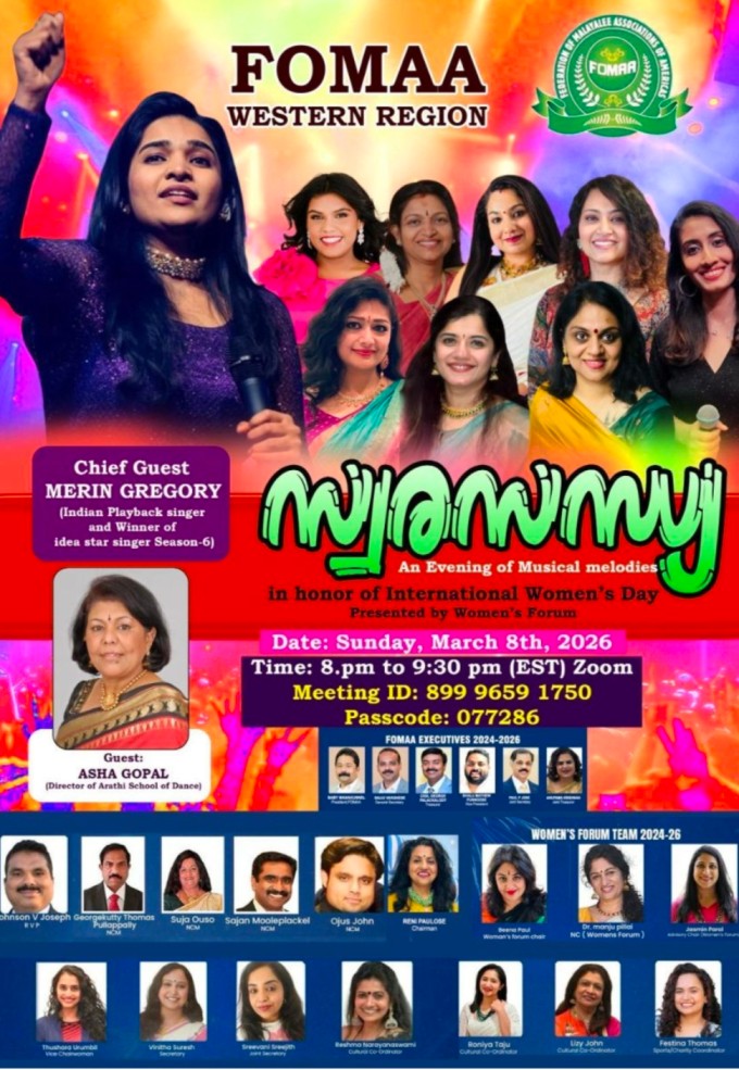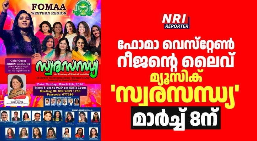 കലിഫോർണിയ: ദൈന്യദിന ജീവിതത്തിന്റെ മാനസിക പിരിമുറുക്കത്തിൽ നിന്നും അല്പം മാറിനിന്ന് കുറച്ച് ശുദ്ധസംഗീതത്തിന്റെ സ്വരമാധുരിക്കൊപ്പം കാതോർത്തിരിക്കാൻ, അന്താരാഷ്ട്ര വനിതാ ദിനത്തിൽ ഫോമാ വെസ്റ്റേൺ റീജിയന്റെ വുമൺസ് ഫോറത്തിന്റെ നേതൃത്വത്തിൽ നിങ്ങൾക്കായി ‘സ്വരസന്ധ്യ – സംഗീത സായാഹ്നം’ ഒരുക്കുന്നു. മാർച്ച് മാസം എട്ടാം തീയതി ഞായറാഴ്ച വൈകിട്ട് എട്ട് മണി – EST (അഞ്ച് മണി – PST) മുതൽ ആരംഭിക്കുന്ന സ്വരസന്ധ്യ സംഗീത സായാഹ്നത്തിൽ പങ്കെടുക്കുന്നതിനായി ഏവരെയും ക്ഷണിക്കുന്നതായി ആർ.വി.പി ജോൺസൺ ജോസഫ് അറിയിച്ചു. അലയലയായി ഒഴുകിയെത്തുന്ന ശ്രുതി ശുദ്ധമായ ഗാനങ്ങൾ ആലപിക്കുന്നത് പ്രശസ്ത ഗായികയും ഐഡിയ സ്റ്റാർ സിംഗർ സീസൺ-6 വിജയിയുമായ മെറിൻ ഗ്രിഗറിയും, മറ്റു അമേരിക്കൻ മലയാളി ഗായികമാരുമാണ്.
