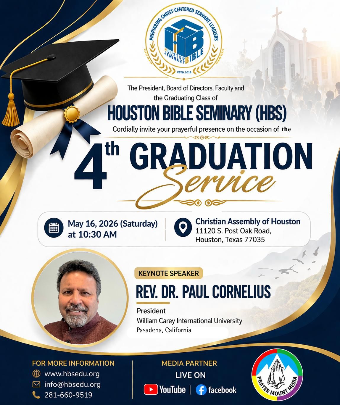 ഹൂസ്റ്റൺ: ഹൂസ്റ്റൺ ബൈബിൾ സെമിനാരി (HBS)യുടെ 4-ാമത് ഗ്രാജുവേഷൻ സർവീസ് മേയ് 16 ശനിയാഴ്ച രാവിലെ 10.30ന് ഹൂസ്റ്റണിലെ ക്രിസ്ത്യൻ അസംബ്ലി ഓഫ് ഹൂസ്റ്റൺ ചർച്ചിൽ (11120 S. Post Oak Road) നടക്കും.കാലിഫോർണിയയിൽ പ്രവർത്തിക്കുന്ന വില്ല്യം കേറി ഇന്റർനാഷണൽ യൂണിവേഴ്സിറ്റിയുടെ പ്രസിഡന്റ് റവ. ഡോ. പോൾ കോർണേലിയസ് മുഖ്യ പ്രഭാഷണം നടത്തും.