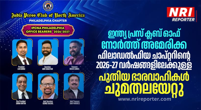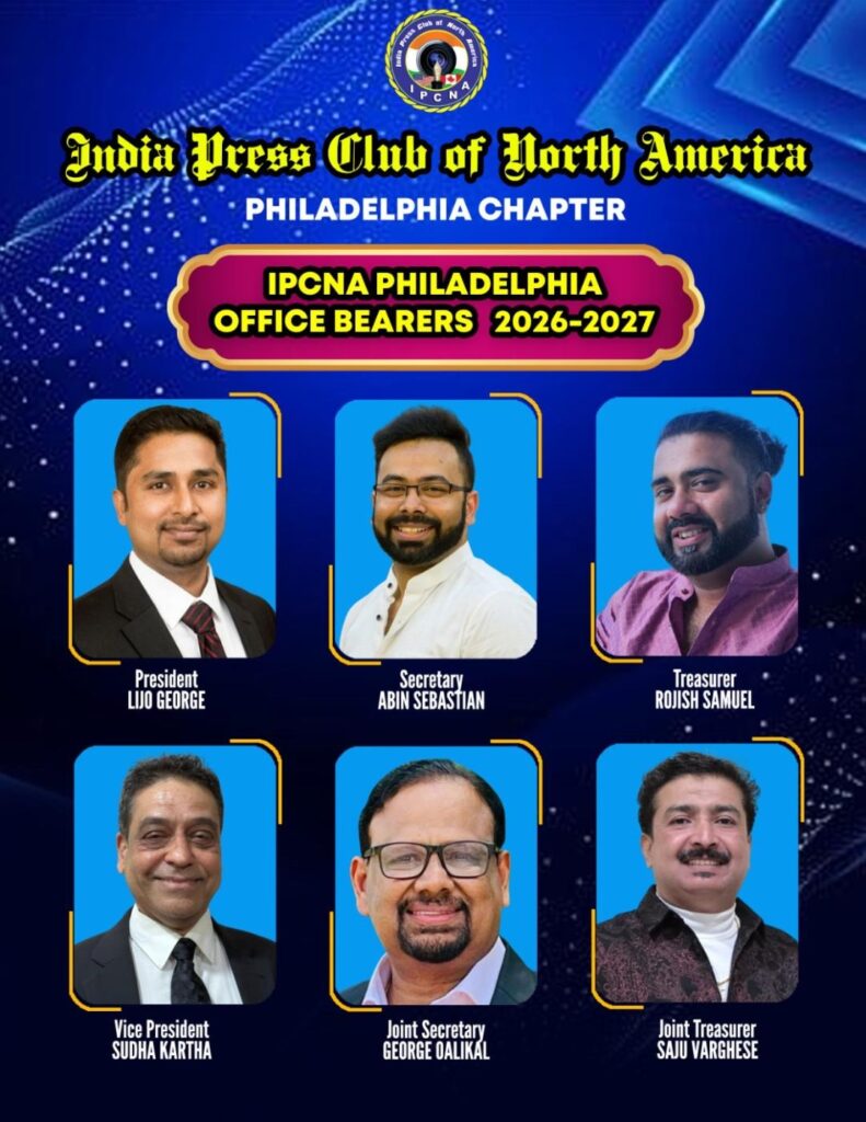 ഫിലാഡൽഫിയ: ഇന്ത്യ പ്രസ് ക്ലബ് ഓഫ് നോർത്ത് അമേരിക്ക ഫിലാഡൽഫിയ ചാപ്റ്ററിന്റെ 2026-27 വർഷങ്ങളിലേക്കുള്ള പുതിയ ഭാരവാഹികൾ ചുമതലയേറ്റു. ലിജോ ജോർജ് പ്രസിഡണ്ട്, അബിൻ സെബാസ്റ്റ്യൻ സെക്രട്ടറി, ട്രഷറർ റോജിഷ് സാമുവൽ, വൈസ് പ്രസിഡണ്ട് സുധ കർത്താ, ജോയിന്റ് സെക്രട്ടറി ജോർജ് ഓലിക്കൽ, സജു വർഗീസ് ജോയിന്റ് ട്രഷറർ എന്നിവരാണ് പുതിയ ഭാരവാഹികൾ. പമ്പ കമ്മ്യൂണിറ്റി സെന്ററിൽ പ്രസിഡന്റ് അരുൺ കോവാട്ടിന്റെ അദ്ധ്യക്ഷതയിൽ ചേർന്ന പൊതുയോഗത്തിലാണ് പുതിയ ഭാരവാഹികളെ തിരഞ്ഞെടുത്തത്.