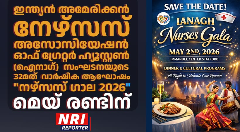 ഹൂസ്റ്റൺ: ഇന്ത്യൻ അമേരിക്കൻ നേഴ്സസ് അസോസിയേഷൻ ഓഫ് ഗ്രേറ്റർ ഹ്യൂസ്റ്റൺ (ഐനാഗ്) എന്ന സംഘടനയുടെ 32മത് വിപുലമായ വാർഷിക ആഘോഷങ്ങൾ മെയ് രണ്ടിന് സ്റ്റാഫോർഡ് ഇമ്മാനുവൽ സെൻററിൽ “നഴ്സസ് ഗാല 2026” എന്ന പേരിൽ സംഘടിപ്പിക്കുന്നു. ആതുര ശുശ്രൂഷ രംഗത്തെ കാവൽ മാലാഖമാർ എന്നറിയപ്പെടുന്നതും ആരോഗ്യ പരിപാലന മേഖലയിൽ കഠിനാദ്ധ്വാനം ചെയ്യുന്നതുമായ ഇന്ത്യക്കാരിൽ ഏറ്റവും അധികം മലയാളികൾ ഉൾപ്പെടുന്ന സംഘടനയാണ് ഐനാഗ്.