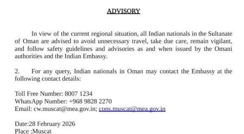 Indian Embassy in Oman advises Indian citizens to avoid unnecessary travel