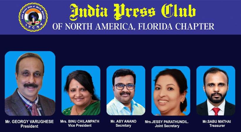 ഫ്ലോറിഡ: അമേരിക്കൻ മലയാളികളുടെ മാധ്യമ കൂട്ടായ്മയായ ഇന്ത്യാ പ്രസ്സ് ക്ലബ്ബ് ഓഫ് നോർത്ത് അമേരിക്ക , ഫ്ലോറിഡ ചാപ്റ്റർ ഭാരവാഹികളെ തെരഞ്ഞെടുത്തു. മാധ്യമ പ്രവർത്തകനും , സാംസ്കാരിക സാമൂഹിക രംഗത്ത് സജീവവും ഫൊക്കാനയുടെ മുൻ പ്രസിഡൻ്റുമായ ജോർജി വർഗ്ഗീസ് നയിക്കുന്ന കമ്മറ്റിയിൽ വൈസ് പ്രസിഡൻ്റ് ബിനു ചിലമ്പത്ത് , സെക്രട്ടറി എബി ആനന്ദ് , ജോ. സെക്രട്ടറി ജെസി പാറത്തുണ്ടിൽ , ട്രഷറർ സാബു മത്തായി , അഡ്വൈസറി ബോർഡ് ചെയർമാൻ സുനിൽ തൈമറ്റം , എക്സ് ഒഫിഷ്യോ മെമ്പർ മാത്യു വർഗ്ഗീസ് എന്നിവരെ തെരഞ്ഞെടുത്തു.