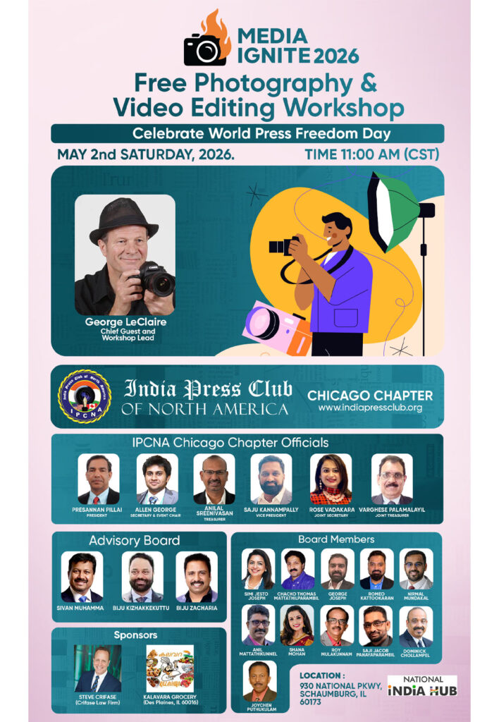 ഷിക്കാഗോ — ലോക മാധ്യമ സ്വാതന്ത്ര്യ ദിനാഘോഷങ്ങളുടെ ഭാഗമായി, ഇന്ത്യ പ്രസ് ക്ലബ് ഓഫ് നോർത്ത് അമേരിക്ക (IPCNA) ഷിക്കാഗോ ചാപ്റ്റർ സംഘടിപ്പിക്കുന്ന സൗജന്യ മീഡിയ പരിശീലന വർക്ക്ഷോപ്പ് ‘മീഡിയ ഇഗ്നൈറ്റ് 2026’ മെയ് 2-ാം തീയതി ശനിയാഴ്ച രാവിലെ 11 മണിക്ക് ഷാംബർഗ്, ഇലിനോയിയിലെ നാഷണൽ ഇന്ത്യ ഹബ്ബിൽ നടക്കും.