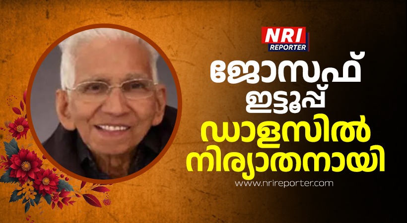 ഡാളസ് : ജോസഫ് ഇട്ടൂപ്പ് (ബേബിച്ചന് 96) ജനുവരി 4 ഞായറാഴ്ച അമേരിക്കയില് നിര്യാതനായി. വൈക്കം മണ്ണത്താനത്ത് പുത്തനങ്ങാടി പെരുവേലി കുടുംബാംഗമാണ്. വെള്ളിയാഴ്ച ( 1/09/2026) കൊപ്പേല് സെന്റ് ആന്സ് കത്തോലിക്കാ ദേവാലയത്തില് മരണാനന്തര ശുശ്രൂഷ നടത്തുകയും തുടര്ന്ന് റോളിംങ്ങ് ഓക്ക്സ് സെമിത്തേരിയില് സംസ്ക്കാരം.