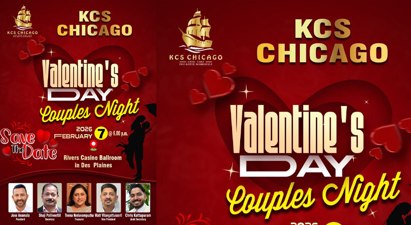 ചിക്കാഗോ: കെ സി എസ് ചിക്കാഗോയുടെ 2026 വാലന്റൈൻസ് ഡേ/ കപ്പിൾസ് നൈറ്റ് ഒരുക്കങ്ങൾ റോസ് മൗണ്ട് റിവേഴ്സ് കാസിനോയിലെ ബോൾ റൂമിൽപുരോഗമിച്ചു കൊണ്ടിരിക്കുന്നു. ഫെബ്രുവരി 7 ന് നടക്കുന്ന ഈ വർഷത്തെ വാലന്റൈൻസ് ഡേ കപ്പിൾസ് നൈറ്റ് ആഘോഷങ്ങൾ മുൻ വർഷങ്ങളതിനേക്കാൾ വ്യത്യസ്തമായി ലക്കി ഇൻ ലവ്, വാലന്റൈൻസ് ഡേ കപ്പിൾസ് കസിനോ നൈറ്റ് ആയിട്ട് ആയിരിക്കും ആഘോഷിക്കപ്പെടുക എന്ന് കെ സി എസ് പ്രസിഡൻ്റ് ജോസ് ആന മലയും, ട്രഷുറാർ ടീന നെടുവാമ്പുഴയും മീഡിയ പ്രസ്താവനയിൽ അറിയിക്കുകയുണ്ടായി.