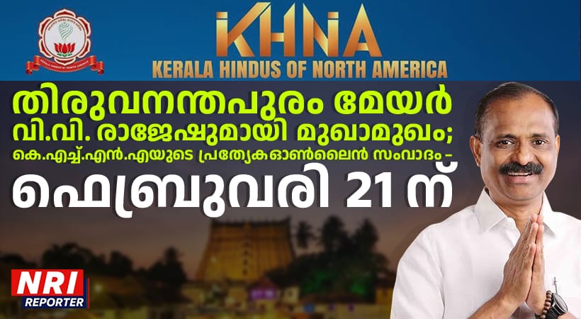 ഫ്ലോറിഡ: നോർത്ത് അമേരിക്കയിലെ മലയാളി ഹിന്ദുക്കളുടെ ദേശീയ സംഘടനയായ Kerala Hindus of North America (KHNA), തിരുവനന്തപുരം നഗരസഭ മേയർ വി.വി. രാജേഷുമായി പ്രത്യേക ഓൺലൈൻ സംവാദം സംഘടിപ്പിക്കുന്നു. കേരളത്തിന്റെ തലസ്ഥാന നഗരത്തിനെക്കുറിച്ചും പ്രവാസി സമൂഹത്തിന്റെ പങ്കാളിത്ത സാധ്യതകളെക്കുറിച്ചും നേരിട്ട് ചർച്ച ചെയ്യാനുള്ള അപൂർവ അവസരമായിരിക്കും ഇത്.