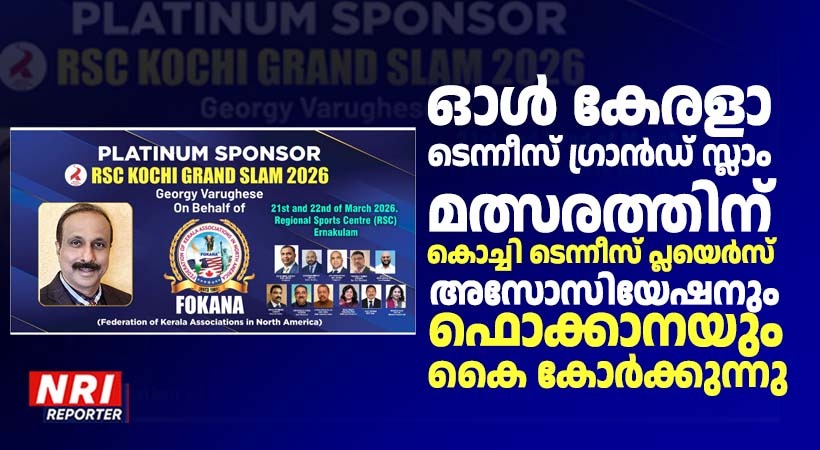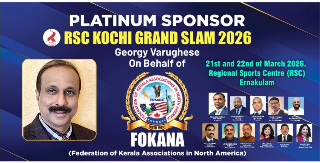 ഫ്ലോറിഡ: വെറ്ററൻ സർക്യൂട്ട് വിഭാഗത്തിലെ സംസ്ഥാനത്തെ ഏറ്റവും വലിയ ടൂർണമെന്റായ RSC കൊച്ചി ഗ്രാൻഡ് സ്ലാം 2026, മാർച്ച് 21-22 തീയതികളിൽ എറണാകുളം റീജിയണൽ സ്പോർട്സ് സെന്റർ (RSC)-ലെ ജസ്റ്റിസ് പി ഗോവിന്ദൻ നായർ ഇൻഡോർ ടെന്നീസ് കോംപ്ലക്സ്കിൽ അരങ്ങേറുബോൾ ഫൊക്കാനയും ഇതിൽ ഭാഗമാകുന്നു.