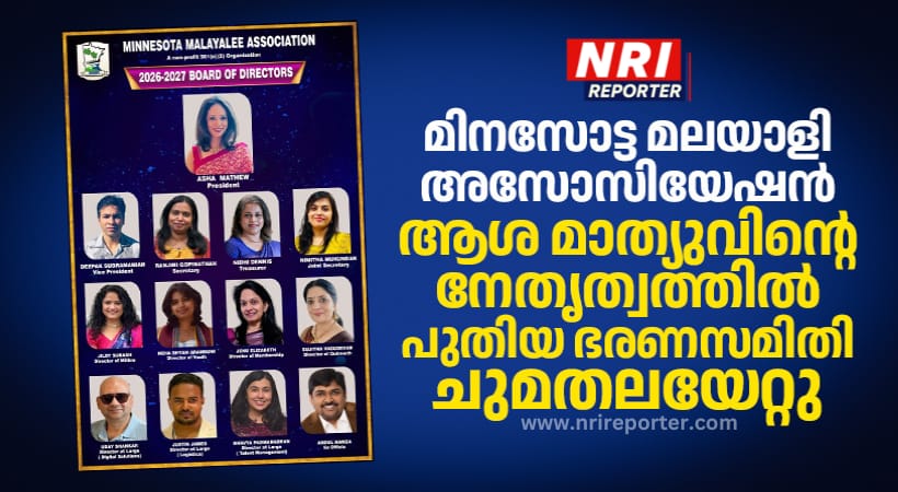 മിനസോട്ട: മിനസോട്ട മലയാളി അസോസിയേഷന്റെ (MMA) പുതിയ പ്രസിഡന്റായി ആശ മാത്യു ചുമതലയേറ്റു. പുതുവത്സരത്തോടനുബന്ധിച്ച് നടന്ന ഔദ്യോഗിക ചടങ്ങിലാണ് പുതിയ ഭരണസമിതി സംഘടനയുടെ ചുമതലയേറ്റെടുത്തത്.
