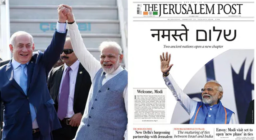 പത്രത്തിൻ്റെ ഒന്നാം പേജിൽ കൈവീശി അഭിവാദ്യം ചെയ്യുന്ന മോദിയുടെ വലിയ ചിത്രത്തോടൊപ്പം ‘വെൽകം മോദി’ എന്നും, ‘രണ്ട് പുരാതന രാഷ്ട്രങ്ങൾ പുതിയ അധ്യായം തുറക്കുന്നു’ എന്നും രേഖപ്പെടുത്തിയിട്ടുണ്ട്. 25, 26 തീയതികളിലാണ് മോദി ഇസ്രായേലിൽ ഔദ്യോഗിക സന്ദർശനം നടത്തുന്നത്.