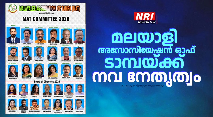 ഫ്ലോറിഡ: മലയാളി അസോസിയേഷൻ ഓഫ് ടാമ്പായുടെ പതിമൂന്നാമത് പ്രസിഡണ്ടായി തിരഞ്ഞെടുക്കപ്പെട്ട ബിജോയ് ജോസഫിന്റെ നേതൃത്വത്തിലുള്ള ഭരണസമിതി ചുമതല ഏറ്റു. മുൻ പ്രസിഡണ്ട് ജോൺ കല്ലോലിക്കലിന്റെ അധ്യക്ഷതയിൽ ചേർന്ന പൊതുയോഗമാണ് പുതിയ ഭരണസമിതിക്ക് അംഗീകാരം നൽകിയത്.