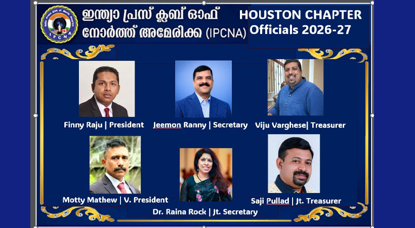 സ്റ്റാഫോർഡ്: ഇന്ത്യ പ്രസ് ക്ലബ് ഓഫ് നോർത്ത് അമേരിക്ക (IPCNA) ഹൂസ്റ്റണ് ചാപ്റ്ററിന്റെ അടുത്ത രണ്ടു വര്ഷത്തേക്കുള്ള പുതിയ ഭാരവാഹികളെ തിരഞ്ഞെടുത്തു. ഡിസംബര് 19 വെള്ളിയാഴ്ച വൈകുന്നേരം സ്റ്റാഫോർഡിലെ നേർക്കാഴ്ച പത്രത്തിന്റെ ഓഫീസിൽ വച്ച് നടന്ന വാർഷിക പൊതുയോഗത്തിലാണ് തിരഞ്ഞെടുപ്പ് നടന്നത്.