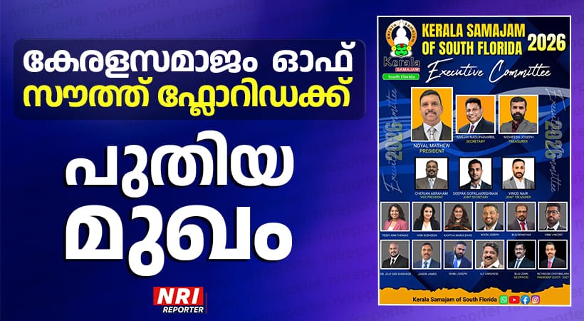 കേരളസമാജം ഓഫ് സൗത്ത് ഫ്ലോറിഡയുടെ 43-ാമത് പ്രസിഡന്റായി നോയൽ മാത്യു തിരഞ്ഞെടുക്കപ്പെട്ടു. ഇദ്ദേഹത്തിന്റെ നേതൃത്വത്തിലുള്ള 18 അംഗ ഭരണസമിതി 2026 ജനുവരി ഒന്നിന് ഔദ്യോഗികമായി ചുമതലയേറ്റു. കഴിഞ്ഞ ഡിസംബർ 13-ന് ചേർന്ന സംഘടനയുടെ പൊതുയോഗമാണ് പുതിയ ഭരണസമിതിക്ക് ഐകകണ്ഠ്യേന അംഗീകാരം നൽകിയത്. സൗത്ത് ഫ്ലോറിഡയിലെ പ്രവാസി മലയാളി സമൂഹത്തിനിടയിൽ സജീവമായ ഇടപെടലുകൾ നടത്താനാണ് പുതിയ സമിതി ലക്ഷ്യമിടുന്നത്.