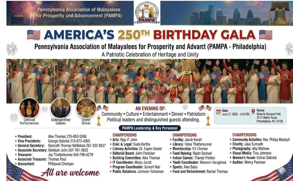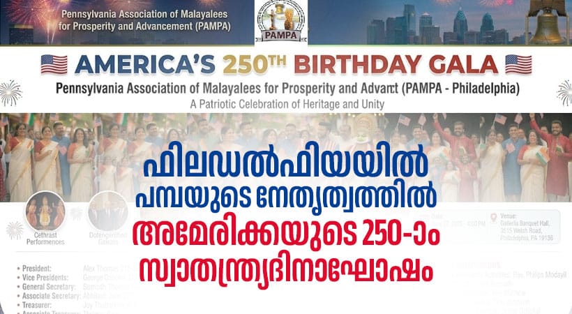 ഫിലഡൽഫിയ: പെൻസിൽവാനിയ അസോസിയേഷൻ ഓഫ് മലയാളീസ് ഫോർ പ്രോസ്പെരിറ്റി ആൻഡ് അഡ്വാൻസ്മെന്റ് (PAMPA Philadelphia)യുടെ ആഭിമുഖ്യത്തിൽ അമേരിക്കയുടെ 250-ാം സ്വാതന്ത്ര്യദിനാഘോഷത്തോടനുബന്ധിച്ച് വിപുലമായ സാംസ്കാരിക പരിപാടി സംഘടിപ്പിക്കുന്നു. ജൂൺ 27, 2026-ന് വൈകുന്നേരം 4 മണിക്ക് ഫിലഡൽഫിയയിലെ ഗാലറിയ ബാൻക്വറ്റ് ഹാളിൽ (3515 Welsh Road, Philadelphia, PA 19136) നടക്കുന്ന ഈ പരിപാടിയിൽ സമൂഹ ഐക്യവും സംസ്കാരപരമായ വൈവിധ്യവും ദേശസ്നേഹവും ഒരുമിപ്പിക്കുന്ന വിവിധ കലാപരിപാടികളും വിരുന്നും ഉണ്ടായിരിക്കും. പ്രമുഖ രാഷ്ട്രീയ നേതാക്കളും വിശിഷ്ടാതിഥികളും ചടങ്ങിൽ പങ്കെടുക്കും.