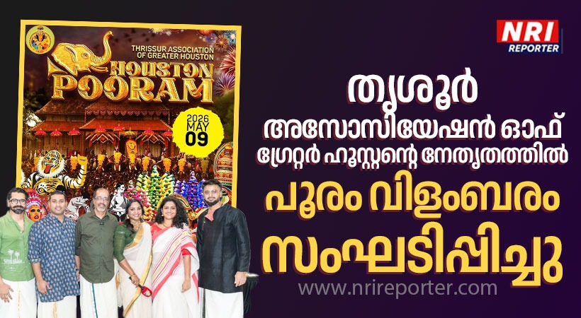 ഹൂസ്റ്റൺ : തൃശൂർ അസോസിയേഷൻ ഓഫ് ഗ്രേറ്റർ ഹൂസ്റ്റന്റെ നേതൃതത്തിൽ പൂരം വിളംബരം സംഘടിപ്പിച്ചു. 2026 തൃശൂർ പൂരം മെയ് 9ന് ഹൂസ്റ്റനിൽ അതിഗംഭീരമായി നടത്തുന്നതിന് .ഫെബ്രുവരി 6ന് സ്റ്റാഫോർഡിൽ വച്ചു ചേർന്ന യോഗം തീരുമാനിച്ചു