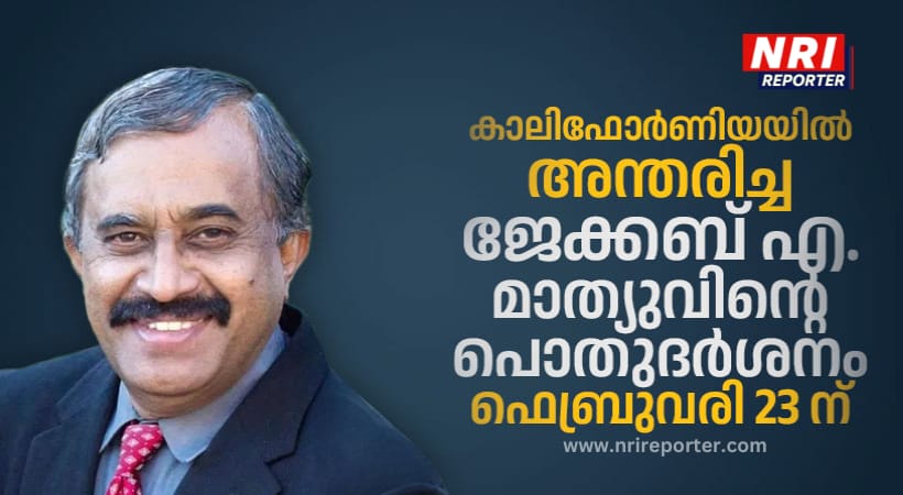 കാലിഫോർണിയ: അയ്രൂക്കുഴിയിൽ കുടുംബാംഗമായ ജേക്കബ് എ. മാത്യുവിന്റെ (രാജു, മേടയിൽ) പൊതുദർശനം ഫെബ്രുവരി 23, തിങ്കളാഴ്ച കാലിഫോർണിയയിൽ നടക്കും. 1972-ൽ അമേരിക്കയിലേക്ക് കുടിയേറിയ അദ്ദേഹം കാലിഫോർണിയയിലെ ലോസ് ഏഞ്ചൽസ് മാർത്തോമാ ചർച്ചിലെ സ്ഥാപക അംഗങ്ങളിൽ ഒരാളായിരുന്നു. സഭയിലും നോർത്ത് അമേരിക്കൻ ഭദ്രാസനത്തിലും സജീവമായിരുന്ന അദ്ദേഹം ഭദ്രാസന അസംബ്ലി അംഗമായും പ്രവർത്തിച്ചിട്ടുണ്ട്. സഭയുടെയും ഭദ്രാസനത്തിന്റെയും പ്രവർത്തനങ്ങളിൽ സന്നദ്ധസേവകനായി അദ്ദേഹം വലിയ സംഭാവനകൾ നൽകി.