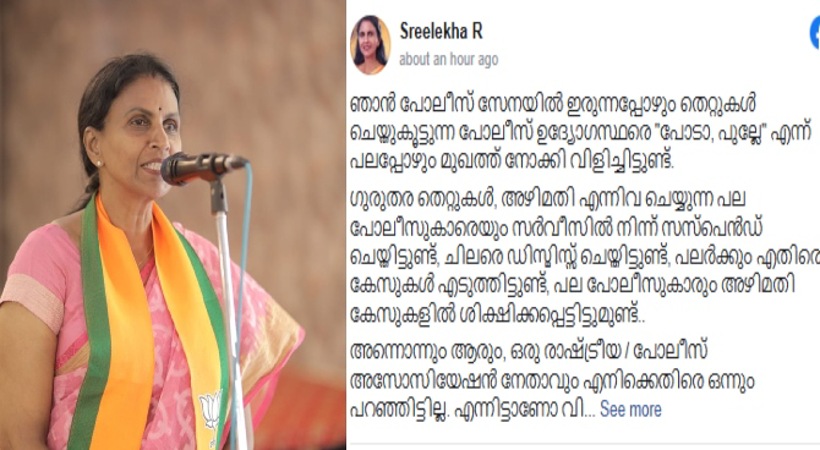 പലർക്കും എതിരെ കേസുകൾ എടുത്തിട്ടുണ്ട്, പല പൊലീസുകാരും അഴിമതി കേസുകളിൽ ശിക്ഷിക്കപ്പെട്ടിട്ടുമുണ്ട്. അന്നൊന്നും ആരും, ഒരു രാഷ്ട്രീയ / പൊലീസ് അസോസിയേഷൻ നേതാവും എനിക്കെതിരെ ഒന്നും പറഞ്ഞിട്ടില്ല. എന്നിട്ടാണോ വിരമിച്ച ശേഷം ഇങ്ങനെ തെറ്റുകൾ ചെയ്തു കൂട്ടുന്ന ഒരുത്തനെ ‘പോടാ’ എന്ന് വിളിച്ചതിൽ ഇവരൊക്കെ തെറ്റ് കാണുന്നത്? ശ്രീലേഖ ഫേസ്ബുക്ക് കുറിപ്പിൽ കൂട്ടിച്ചേർത്തു.