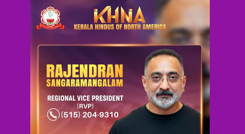 നോർത്ത് അമേരിക്കയിലെ മലയാളി ഹിന്ദുക്കളുടെ ദേശീയ സംഘടനയായ കെഎച്ച്എൻഎ (Kerala Hindus of North America )യുടെ മിഡ്വെസ്റ്റ് റീജിയണൽ വൈസ് പ്രസിഡന്റായി (RVP) രാജേന്ദ്രൻ ശങ്കരമംഗലം (രാജ് നായർ) നിയമിതനായി.