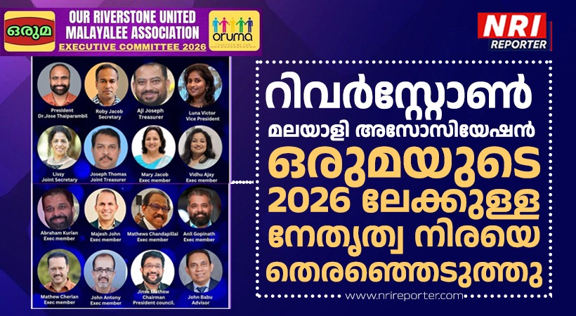 ഹൂസ്റ്റൺ: റിവർസ്റ്റോൺ മലയാളി അസോസിയേഷൻ ഒരുമയുടെ 2026 ലേക്കുള്ള നേതൃത്വ നിരയെ ഒരുമയുടെ ജനറൽ ബോഡി യോഗം തെരഞ്ഞെടുത്തു. പ്രസിഡൻറായി ഡോ.ജോസ് തൈപ്പറമ്പിലും വൈസ് പ്രസിഡൻറായി ലൂണാ വിക്ടറും തെരഞ്ഞെടുക്കപ്പെട്ടു.സെക്രട്ടറിയായി റോബി ജേക്കബ്,ജോയിൻറ് സെക്രട്ടറിയായി ലിസി, ട്രഷററായി അജി ജോസഫ്,ജോയിൻറ് ട്രഷററായി ജോസഫ് തോമസ് എന്നിവർ സേവനം അനുഷ്ടിക്കും.