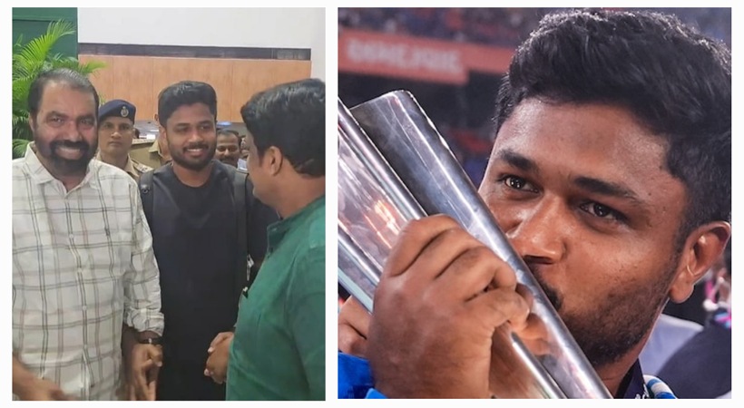 ട്വന്റി 20 ലോകകപ്പിലെ ഐതിഹാസിക വിജയത്തിന് ശേഷം മലയാളി താരം സഞ്ജു സാംസൺ ജന്മനാടായ തിരുവനന്തപുരത്ത് മടങ്ങിയെത്തി. തിങ്കളാഴ്ച വൈകുന്നേരം വിമാനത്താവളത്തിലെത്തിയ സഞ്ജുവിനെ സംസ്ഥാന സർക്കാരിനെ പ്രതിനിധീകരിച്ച് വിദ്യാഭ്യാസ മന്ത്രി വി. ശിവൻകുട്ടി സ്വീകരിച്ചു. എ.എ. റഹീം എംപി അടക്കമുള്ള പ്രമുഖരും ആരാധകരും താരത്തെ വരവേൽക്കാൻ വിമാനത്താവളത്തിൽ തടിച്ചുകൂടിയിരുന്നു. ‘സഞ്ജു ചേട്ടാ’ എന്ന ആർപ്പുവിളികളോടെയാണ് ആയിരക്കണക്കിന് ക്രിക്കറ്റ് പ്രേമികൾ തങ്ങളുടെ പ്രിയതാരത്തെ സ്വീകരിച്ചത്. എല്ലാവർക്കും നന്ദി അറിയിച്ചാണ് താരം വിമാനത്താവളത്തിൽ നിന്ന് മടങ്ങിയത്.