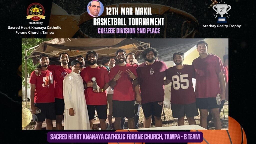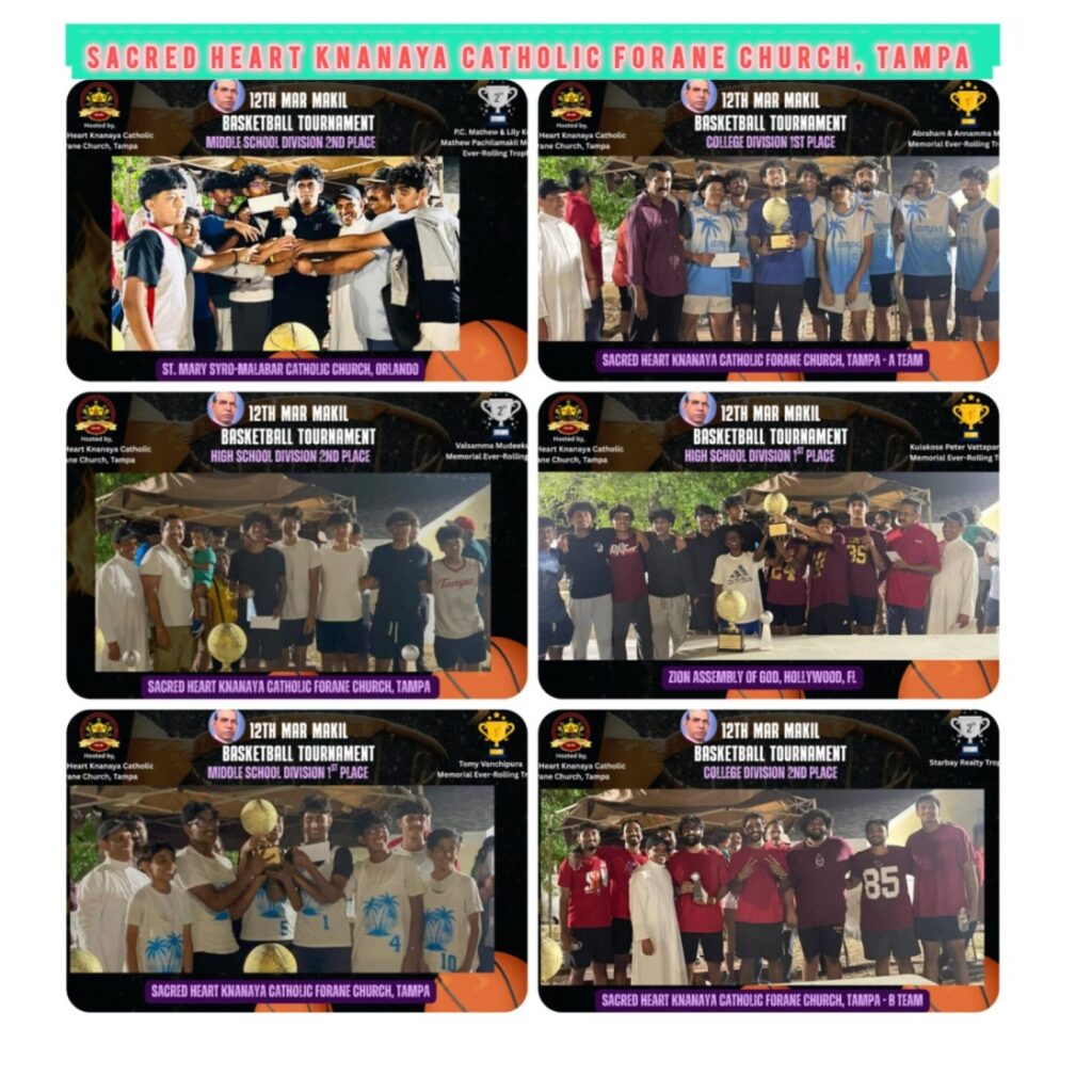 താമ്പാ (ഫ്ളോറിഡ): സേക്രഡ് ഹാർട്ട് ക്നാനായാ കത്തോലിക്കാ ഫൊറോന പള്ളിയിൽ നടന്ന പന്ത്രണ്ടാമത് മാർ മാക്കീൽ ബാസ്ക്കറ്റ്ബോൾ ടൂർണമെൻ്റ് ആവേശമായി മാറി. ശനിയാഴ്ച്ച രാവിലെ ഒൻപത് മണി മുതൽ ആരംഭിച്ച മത്സരങ്ങൾ രാത്രി എട്ടുമണിയോടെയാണ് സമാപിച്ചത്. ഫ്ലോറിഡ സംസ്ഥാനത്തെ വിവിധ മലയാളി ക്രൈസ്തവ ദേവാലയങ്ങളിൽ നിന്നായി മിഡിൽ സ്കൂൾ, ഹൈസ്കൂൾ, കോളേജ് വിഭാഗങ്ങളിലായി 15 ടീമുകൾ മത്സരത്തിൽ പങ്കെടുത്തു.