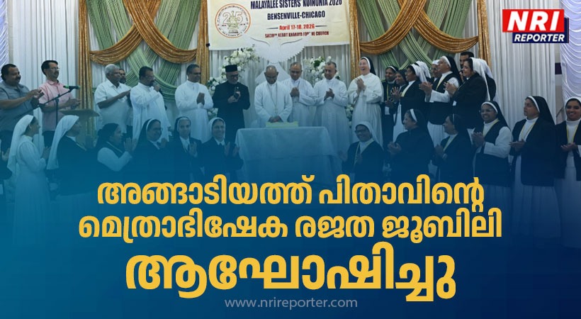 ഷിക്കാഗോ: സെൻ്റ് തോമസ് സീറോ മലബാർ രൂപതാസ്ഥാപനത്തിൻ്റെയും അഭിവന്ദ്യ മാർ ജേക്കബ് അങ്ങാടിയത്ത് പിതാവിൻ്റെ മെത്രാഭിഷേകത്തിൻ്റെയും രജത ജൂബിലിയുടെ ഭാഗമായി ഷിക്കാഗോയിലെ ബെൻസൻവിൽ സേക്രഡ് ഹാർട്ട് ക്നാനായ കത്തോലിക്കാ ഫൊറോനാ ദേവാലയത്തിൽ വച്ചു നടന്ന അമേരിക്കയിലും കാനഡയിലും ശുശ്രൂഷ ചെയ്യുന്ന എല്ലാ മലയാളി സിസ്റ്റേഴ്സിൻ്റെയും സംഗമത്തിൽ ഷിക്കാഗോ സിറോമലബാർ രൂപതയുടെ പ്രഥമ ബിഷപ്പ് ആയ മാർ ജേക്കബ് അങ്ങാടിയത്തിൻ്റെ മെത്രാഭിഷേകത്തിൻ്റെ ജൂബിലി ആഘോഷിച്ചു.