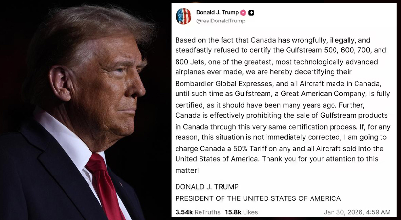 അമേരിക്കൻ നിർമ്മിത ഗൾഫ്സ്ട്രീം 500, 600, 700, 800 ജെറ്റുകൾക്ക് സർട്ടിഫിക്കേഷൻ നൽകുന്നതിൽ കാനഡ മനഃപൂർവം കാലതാമസം വരുത്തുന്നുവെന്നാണ് ട്രംപിൻ്റെ ആരോപണം. ഈ നടപടി നിയമവിരുദ്ധമാണെന്നും അദ്ദേഹം ആരോപിച്ചു.