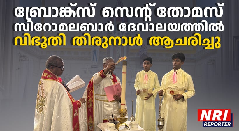 ന്യൂ യോർക്ക് : ബ്രോങ്ക്സ് സെൻ്റ് തോമസ് സിറോ മലബാർ കാത്തലിക് ഫൊറോനാ ദേവാലയത്തിൽ, അമ്പതു നോമ്പിന് തുടക്കം കുറിച്ച്കൊണ്ട്, ഫെബ്രുവരി 16ന് (തിങ്കളാഴ്ച) വിഭൂതി തിരുന്നാൾ ആചരിച്ചു. വൈകുന്നേരം ഏഴ് മണിക്കാരംഭിച്ച തിരുക്കർമ്മങ്ങൾക്ക് വികാരി റവ. ഫാ. കുര്യാക്കോസ് വടാന മുഖ്യകാർമ്മികത്വം വഹിച്ചു. റവ. ഫാ. സോജൻ ഐക്കരകുന്നേൽ എം.എസ്.റ്റി സഹകാർമ്മികനായിരുന്നു.