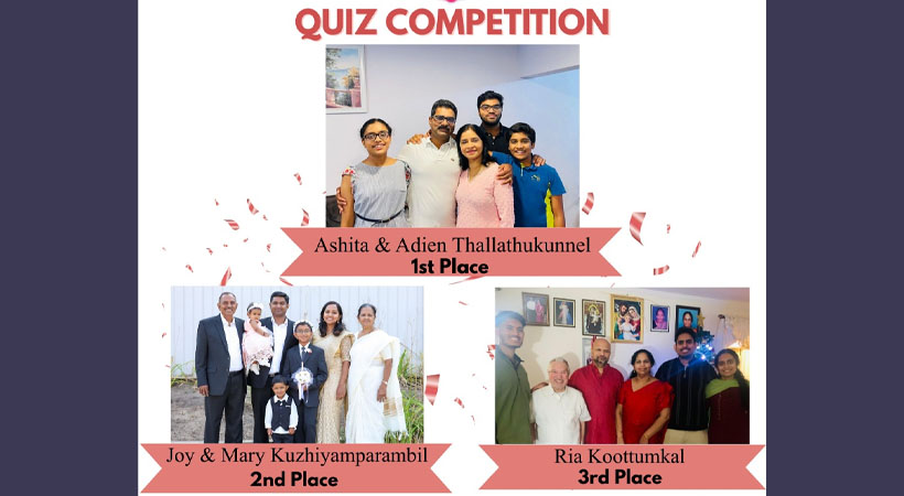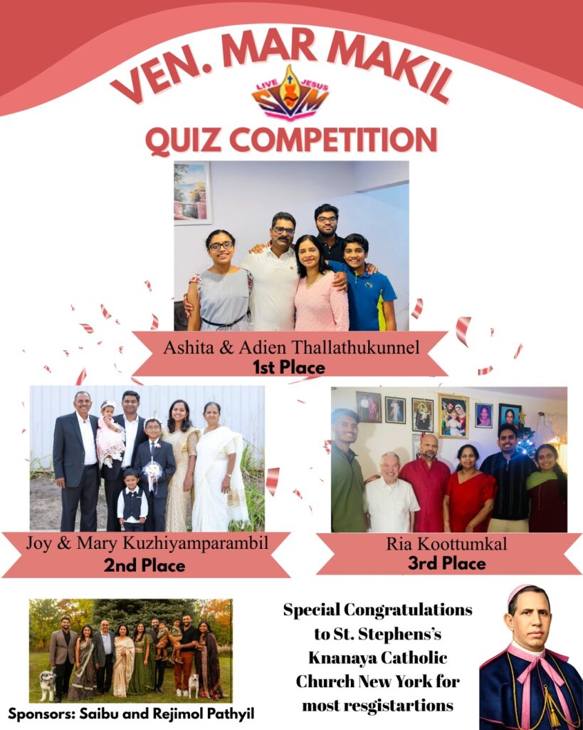 ഷിക്കാഗോ: ധന്യൻ മാർ മാത്യു മാക്കീൽ പിതാവിന്റെ 112-മത് ചരമവാർഷികത്തോടനുബന്ധിച്ചു അമേരിക്കയിലെ ക്നാനായ റീജിയണിൽ നടത്തിയ ക്വിസ് മത്സര വിജയികൾ .